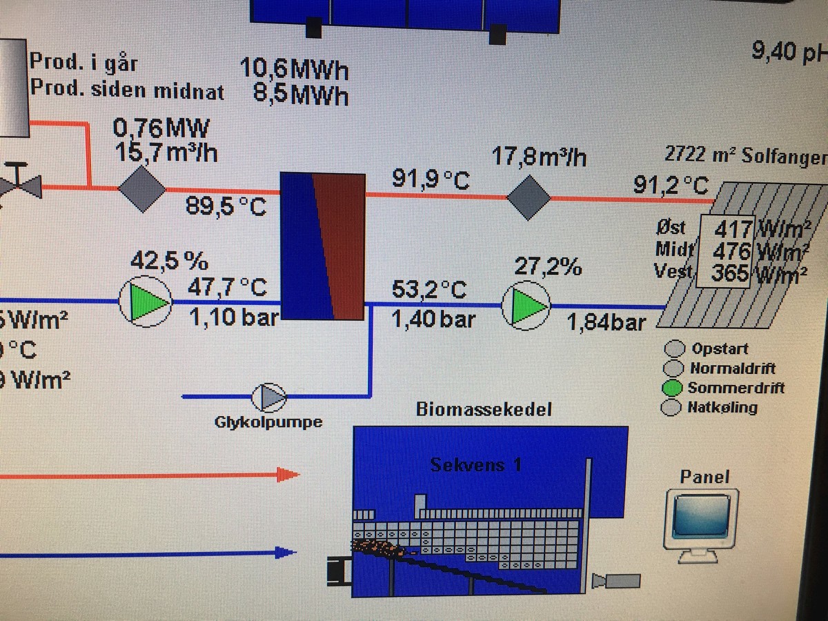 Solvarmeanlægget har foreløbigt de seneste 34 dage ( fra d. 13 til d. 15. juni -2018 ) produceret 100 % af den mængde varme, der er leveret ud på ledningsnettet. Samtidigt har vi varme på lager, i Varmeværkets akkumuleringstank til flere dage, hvis vi skulle få en regnfuld, eller overskyet dag.